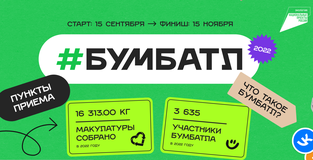 #БумБатл − это соревнование по сбору макулатуры, в котором может принять участие любой желающий. Акция стартовала 15 сентября. Участники поборются не только в количестве собранной бумаги, но и в креативе − необходимо организовать сбор макулатуры, собранное сырье взвесить, сфотографировать, выложить фото или видеопост с хештегами #бумбатл #нацпроектэкология.