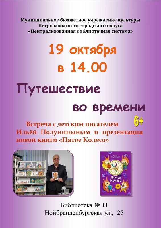 В воскресенье 19 октября в 14:00 в Библиотеке № 11 (Нойбранденбургская ул., д. 25) состоится творческая встреча с известным детским писателем Ильёй Полуницыным. Его книги «Приключения в Белколесье» и «Сказки Кухонного Шкафа» стали победителями конкурса «Книга года Республики Карелия» в номинации «Классная книга» в 2019 и в 2020 годах. В 2024 году Илья Полуницын стал лауреатом литературной премии главы Республики Карелия имени Г. Р. Державина «Во славу Отечества» в номинации «Литература для детей и юношества» за серию детских книг «Белколесье». На встрече Илья Викторович представит новую книгу для детей «Пятое колесо», которая является продолжением историй про дружных и отважных бельчат. Герои сказочного Белколесья — Мирко, Тюрри, Тяп и Пымпышпоня — отправляются в новое невероятное путешествие!